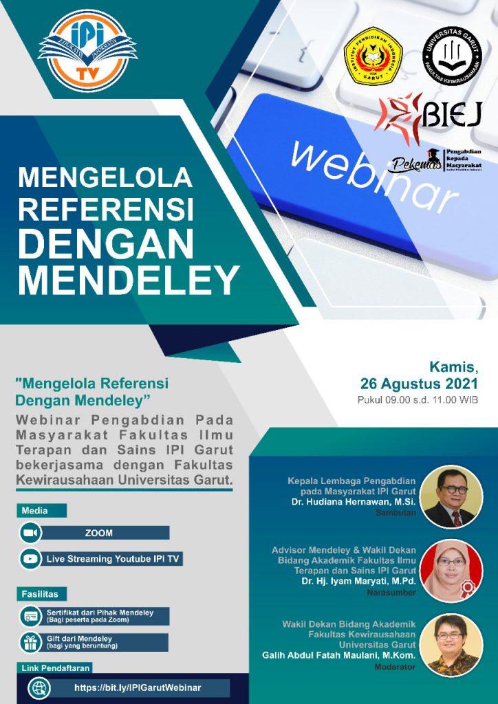 Dalam Rangkaian Kegiatan Pengabdian pada Masyarakat Fakultas Ilmu Terapan dan Sains IPI Garut Bekerjasama dengan Fakultas Kewirausahaan Universitas Garut dan Business Innovation and Entrepreneurship Journal, Kami mengundang Bpk/Ibu Dosen, Peneliti, Guru, Mahasiswa untuk ikut serta dalam kegiatan :